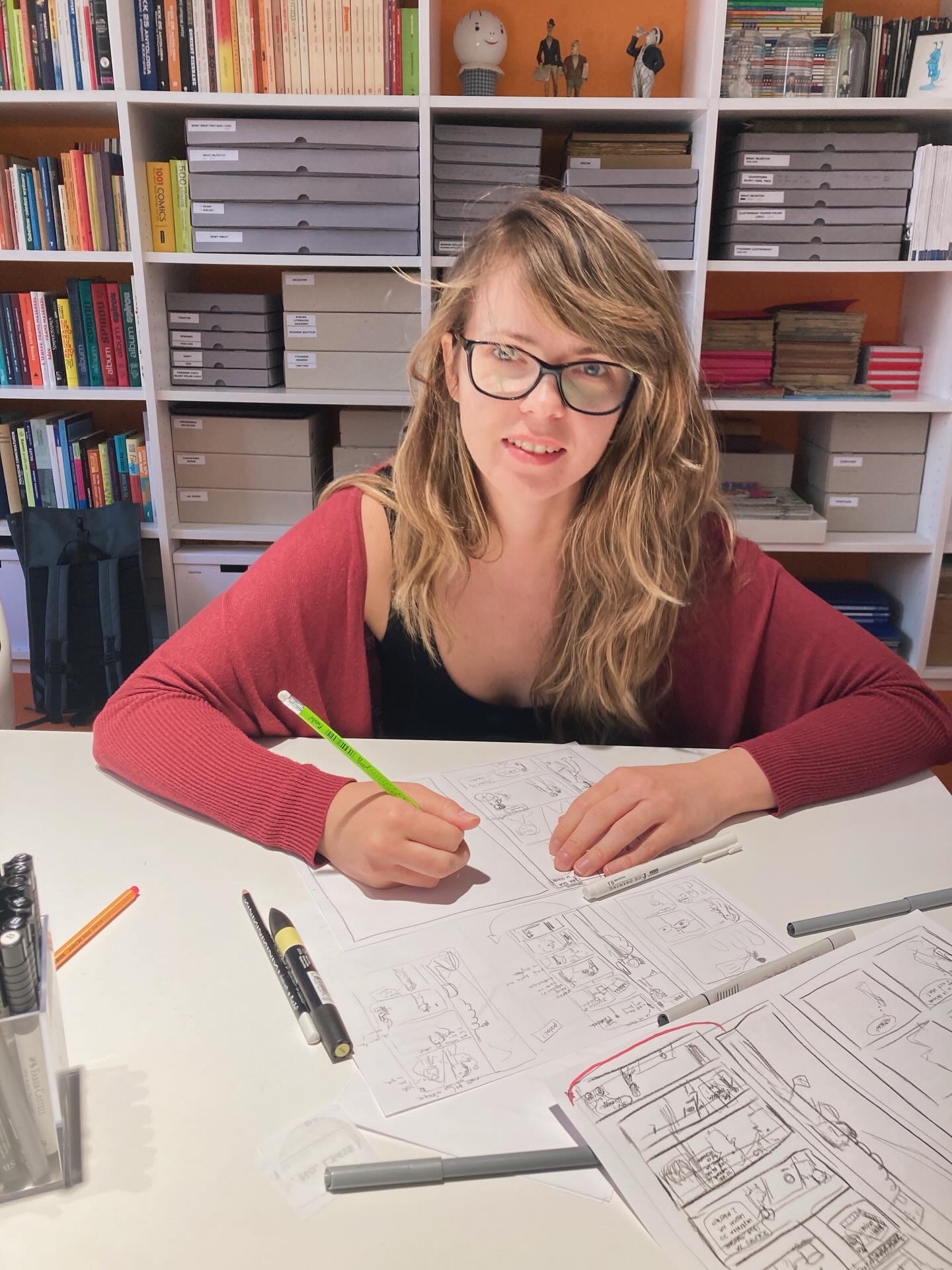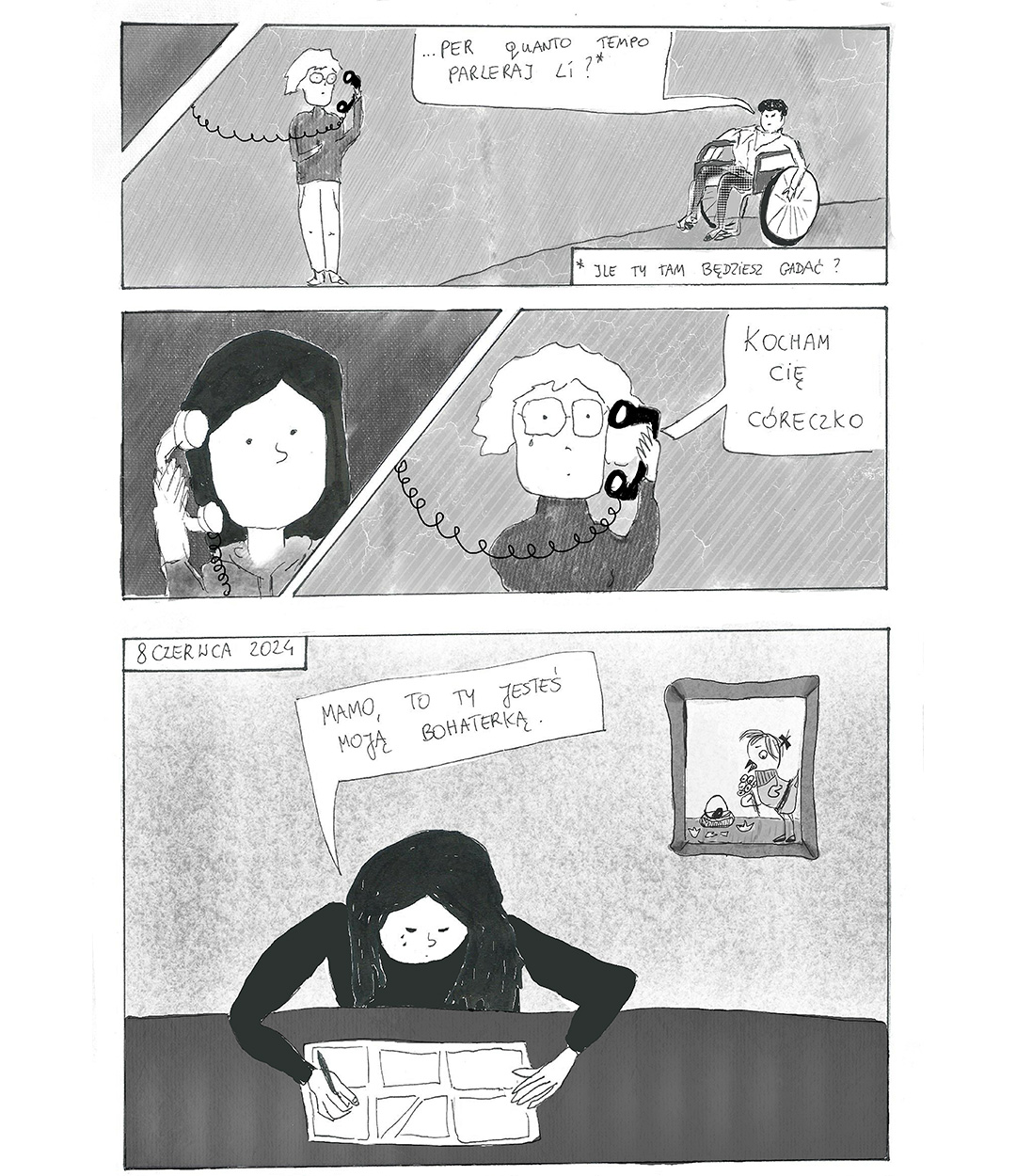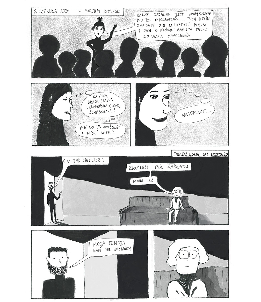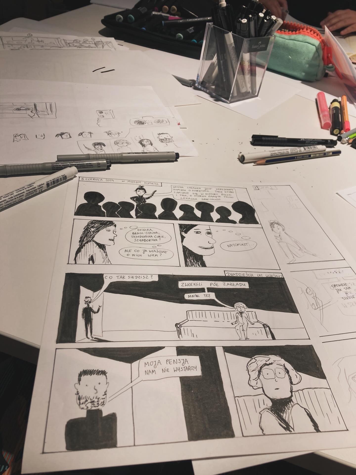 W 2024 roku miałam przyjemność brać udział w komiksowych warsztatach oraz całodniowym hackathonie rysowania komiksów o kobietach w Muzeum Komiksu w Krakowie. Choć wydawałoby się, że jeden dzień to niedużo czasu na początek, to okazało się wystarczająco żeby powstały cztery plansze Odysei Mamy.