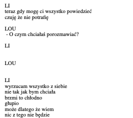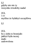 Lubię ten zabieg. Kojarzy mi się z ruchem kamery lub montażowym skokiem. Dopiero jeśli chwilę popatrzę na milczącą postać Li to wypowiedź Jul nabiera odpowiedniego sensu. Można zadać wtedy pytanie: o czym milczy? Jeśli tekst byłby odbierany wyłącznie przez czytelnika to czy taki zabieg częściowo nie wynagradza braku interpretacji aktorskiej? Urozmaica montaż dialogu dodając nieme ujęcia postaci. Wprowadza ciszę, która wstrzymuje rozpędzone wiersze tekstów i pomaga uchwycić klimat sceny. Zachwyca mnie tajemnicza pustka, która widoczna jest wówczas pod imieniem postaci. Zupełnie odwrotnie, niż przy przekreśleniu – tym razem nie mam dostępu do jej myśli. Namiastka magii, podobna do tej, która wytwarza się na scenie, gdy aktorom uda się trwać tu i teraz, w niewiedzy co wydarzy się zaraz.