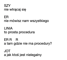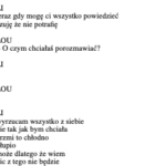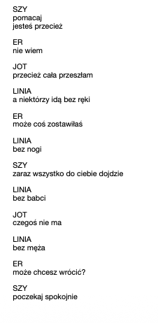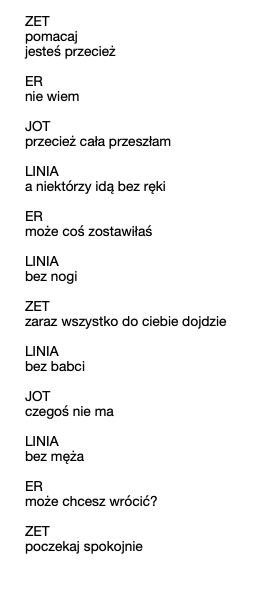 A co jeśli imię jednej z postaci będzie zajmowało więcej przestrzeni niż pozostałe? Czy to tak jakby zajmowała ona więcej przestrzeni na scenie? Można dalej rozważać performatywne potencjały zapisu i być może to byłby świetny moment, żeby wziąć na warsztat przykłady autorów, którzy wyrażali się poprzez oryginalną formę zapisu. W obecnym notatniku refleksji skupiam się jednak wyłącznie na własnym studium przypadku, toteż wracam do przykładów swoich małych eksperymentów.