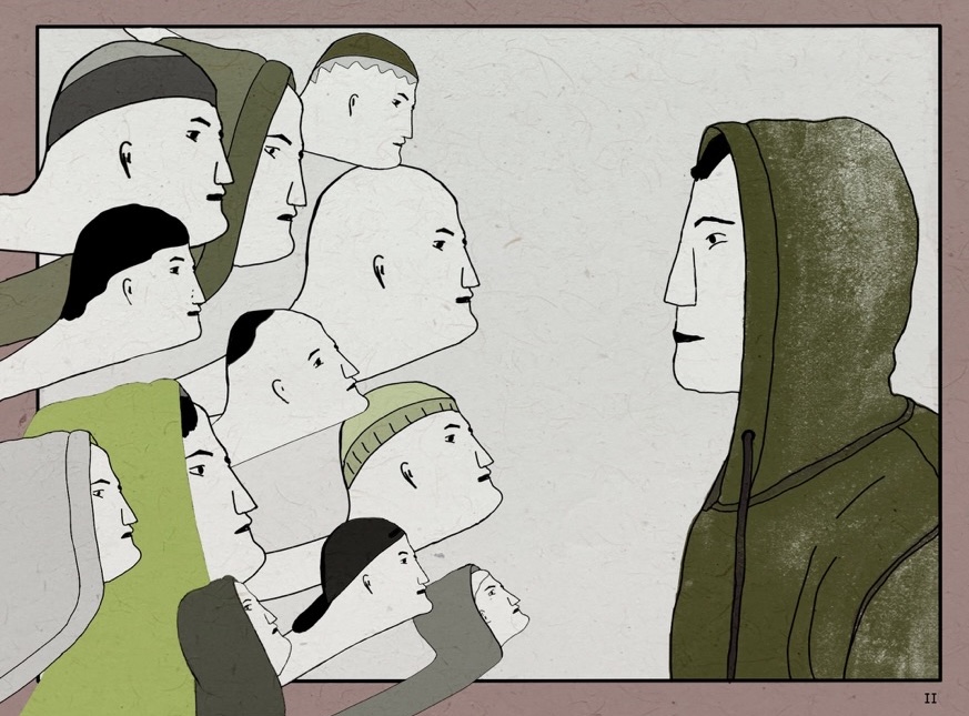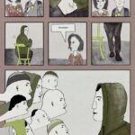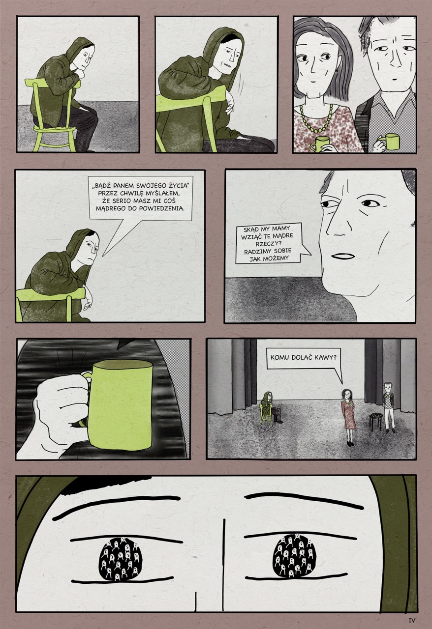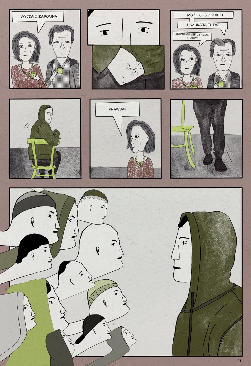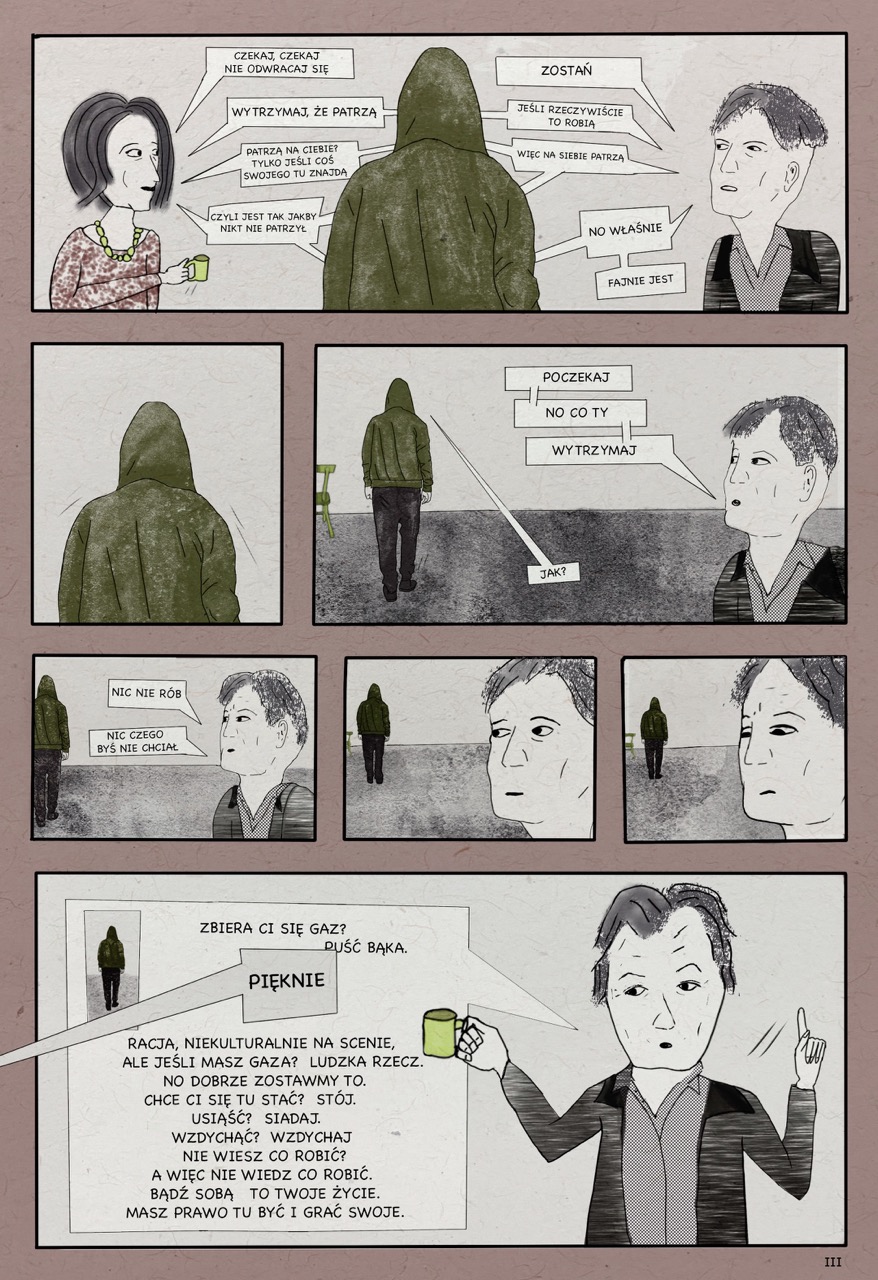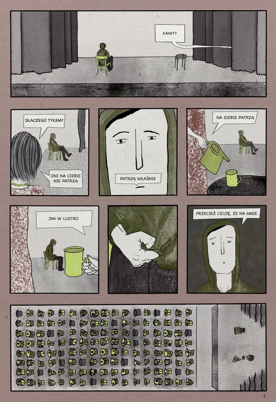 W powyższej scenie bohater patrzy wprost na widownię, której tak się boi. Wyciągnięte szyje widzów, podobnych do samego bohatera, wychodzą nie tylko z ramki, ale również z przestrzeni międzykafelkowej. Chciałam w ten sposób zaznaczyć, że obraz bierze się nie ze świata przedstawionego w opowieści, ale z myśli i lęków głównego bohatera, Kamila. Głowy wyłaniają się z warstwy podświadomej i bezkształtnej, jak pusta przestrzeń międzykafelkowa.