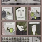 Jest jeszcze przestrzeń między kafelkami. Mityczna przestrzeń, o której mówi się, że tu dzieje się magia w głowie odbiorcy, czyli miejsce, w którym czytelnik sam montuje obrazy, tworząc ciąg wydarzeń. Zaciekawia mnie ta przestrzeń i choć wielu twórców rezygnuje z niej na rzecz bardziej dynamicznych przejść między kadrami, to ja mam ochotę ją zostawić. Rozwijam w swojej głowie pomysł komiksu z narratorem, który ukrywa się między kafelkami. Wyobrażam sobie, jak kolory międzykafelkowej pustki mogłyby podbijać emocje bohatera. Może coś więcej niż kolory? Może jest to ciekawa przestrzeń na symultaniczną mikro narrację? A jeśli ta przestrzeń byłaby większa niż same kafelki? Wszystko zależy od tego, czego chce od nas dana historia, oczywiście.
